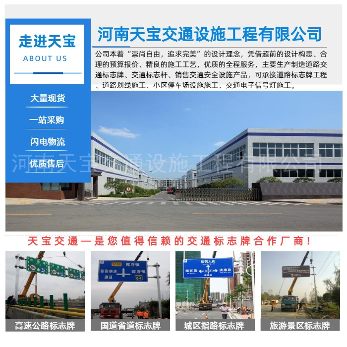 河南天寶交通設(shè)施工程有限公司集研發(fā)、生產(chǎn)、銷售、安裝為一體化的交通標(biāo)志桿標(biāo)牌生產(chǎn)企業(yè),十余年專業(yè)研發(fā)生產(chǎn)經(jīng)驗及數(shù)萬例工程實踐,取得了市場的一致好評,曾多次被市工商局、市民營經(jīng)濟(jì)發(fā)改委、市交通運輸局、市科學(xué)技術(shù)局評選為“守合同重信用企業(yè)、文明誠信文明企業(yè)、交通設(shè)施重點合作單位、科技創(chuàng)新企業(yè)”等榮譽。