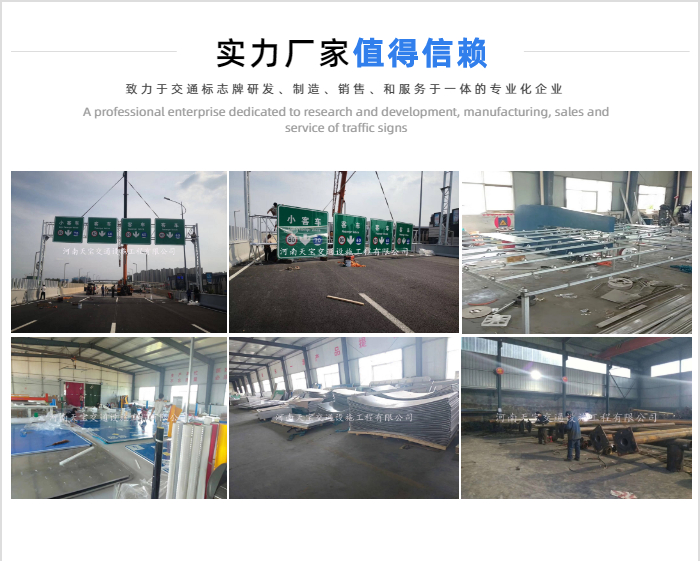 立足中原,展望全國。主要生產(chǎn)交通標(biāo)志桿、龍門架、交通標(biāo)志牌,交通信號桿、交通控桿(交通攝像桿)、并可根據(jù)客戶要求制作各種戶外大型廣告牌,本公司近年來與多家大型實力雄厚的交通設(shè)施企業(yè)建立了長期合作關(guān)系,憑借產(chǎn)品質(zhì)量過硬,按工期準(zhǔn)時交貨,保證了高速公路、省級公路按時通車,獲得客戶的一致認(rèn)可和好評。