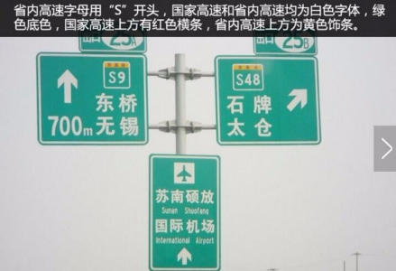 省內(nèi)高速字母用“S”開頭,如S9高速等,國家高速和省內(nèi)高速均為白色字體,綠色底色,國家高速上方有紅色橫條,省內(nèi)高速上方為黃色飾條。需要注意的是,字母“G”和“S”開頭的高速均為全封閉高速公路,只是“S”開頭的標(biāo)識代表該路段屬于某某省境內(nèi),并無其它含義。