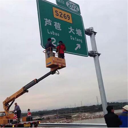 5通過滑動螺栓、抱箍等連接配件將標(biāo)志板固定于支柱上;柱式標(biāo)志的標(biāo)志板內(nèi)緣距路肩邊緣的距離應(yīng)保證20cm,單柱式標(biāo)志牌下緣距路面高度應(yīng)保證250cm,懸臂式安裝凈空須保證距路面5.2m;